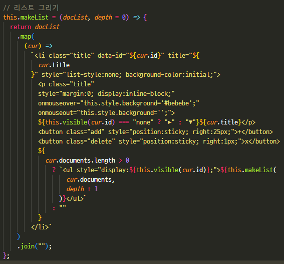 가장 어려울 것이라고 예상됐던 문제는 화면 좌측에 문서 리스트를 구현하는 것이었다. <ul> 태그 안에 <li> 태그를 넣는 구조로 만들고 싶었는데 이것을 API fetch를 통해서 내려받은 자료구조를 활용해서 구현할 자신이 없었기 때문이다. 처음에 BFS, DFS를 활용하여 구현했었는데 <ul> 태그 안에 <li> 태그를 제대로 넣지 못하거나 출력 순서가 거꾸로 되어서 고민을 많이 했다. (지금 보면 이 쉬운걸 왜 못했나 싶다😅)