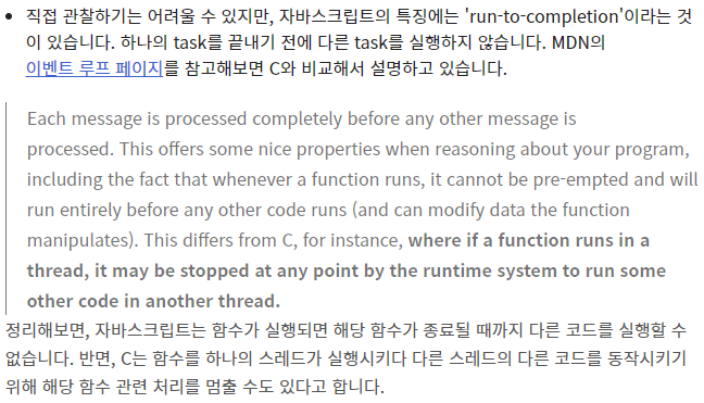 - 자바스크립트의 메인 쓰레드인 이벤트 루프가 싱글 쓰레드 이기 때문에 자바스크립트를 싱글 스레드 언어라고 부른다.