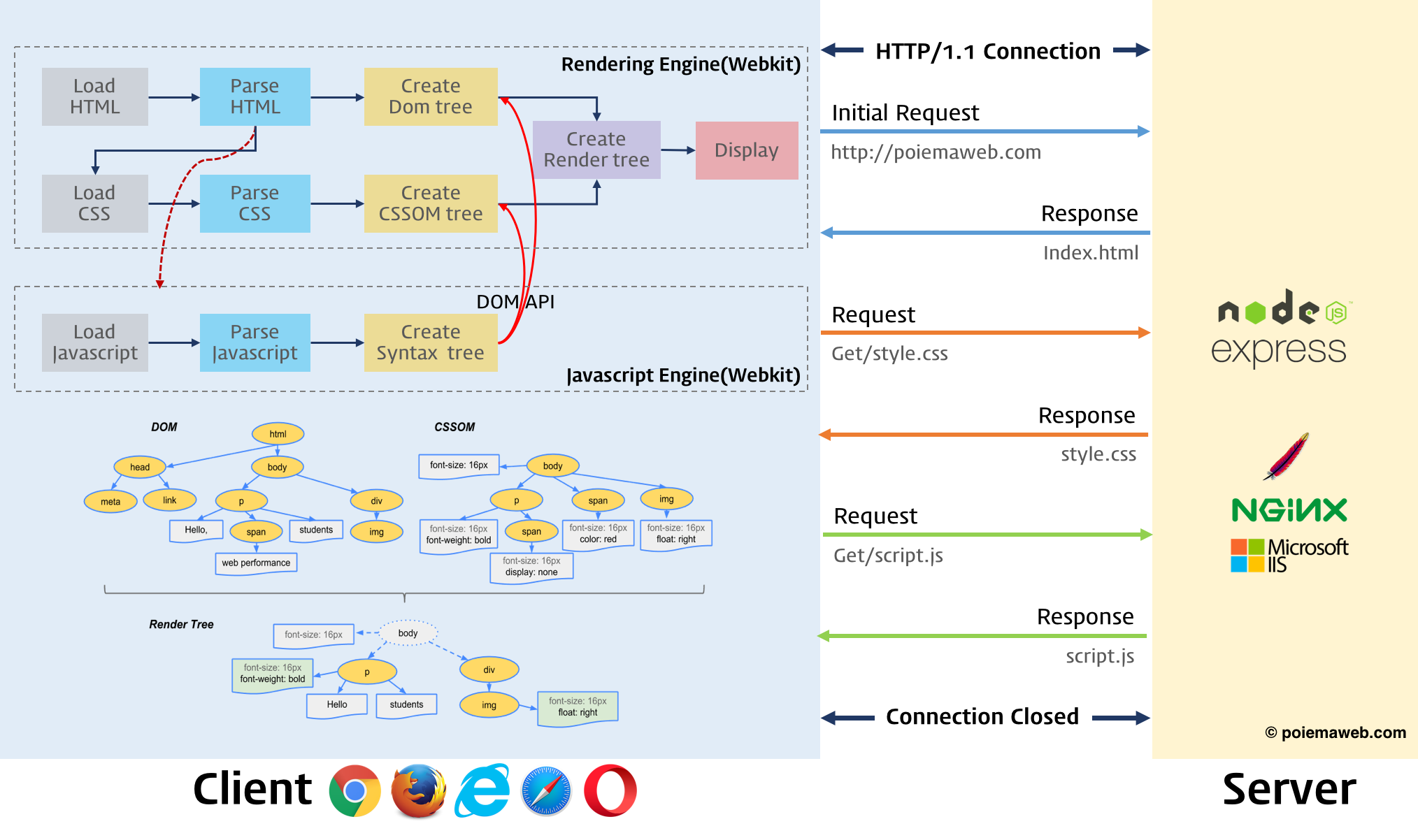 브라우저의 핵심 기능은 사용자가 참고하고자 하는 웹페이지를 서버에 요청(Request)하고 응답(Response)을 받아 브라우저에 표시하는 것이다. 브라우저는 서버로부터 HTML, CSS, Javascript, 이미지 파일 등을 응답받는다. HTML, CSS 파일은 렌더링 엔진의 HTML 파서와 CSS 파서에 의해 파싱(Parsing)되어 DOM, CSSOM 트리로 변환되고 렌더 트리로 결합된다. 이렇게 생성된 렌더 트리를 기반으로 브라우저는 웹페이지를 표시한다.